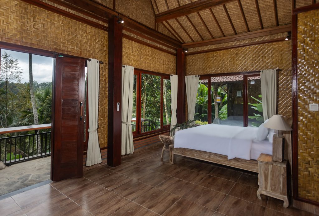 This elegant retreat features a beautifully appointed bedroom that opens directly onto a tranquil shared pool, inviting you to begin your day with a refreshing swim or unwind beneath the soft glow of the evening sky. Every detail from the plush bedding to the natural textures and warm lighting has been carefully curated to create an ambiance of refined relaxation.